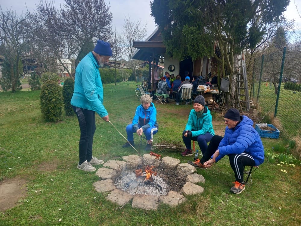 Tady jsme rozdělali oheň, o který se staral především Laďa Janča. Mezi tím se počet účastníků zvedl až na 18. Každý vytáhl své občerstvení, které si donesli a které si opekl na ohni – viz další foto. Jitka měla zajištěn chléb, hořčici a také, protože jsou Velikonoce, Velikonočního beránka – viz foto. Beránek byl naporcován a sněden ke kávě, kterou Jitka podávala.